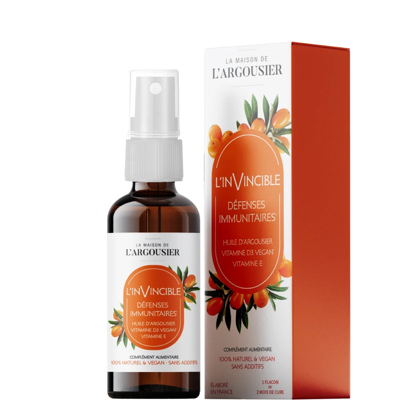Issue du lichen, la vitamine D3 végétale contribue au fonctionnement normal du système immunitaire grâce à son action sur les cellules impliquées dans la réponse naturelle. Cette vitamine liposoluble influence le taux de peptides antimicrobiens et participe à l’équilibre des défenses de première ligne. Chaque pulvérisation de L’Invincible fournit 200 UI, soit 100 % des valeurs nutritionnelles de référence, dans une forme biodisponible et facilement assimilable. Associée aux acides gras essentiels et aux antioxydants de l’huile d’argousier, elle soutient un axe nutritionnel cohérent pour traverser les périodes de fatigue, de froid ou de moindre ensoleillement.